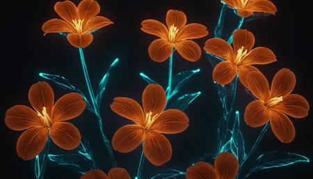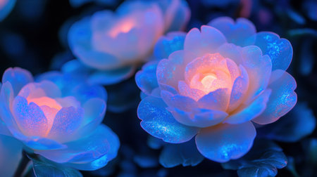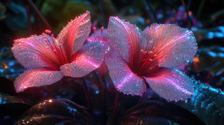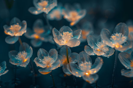 A stunning close-up of vibrant flowers adorned with dew drops, glowing beautifully at night. This artistic portrayal highlights nature's delicate charm.