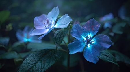 Two vibrant blue flowers with radiant centers are the focal point of this image. Set against a backdrop of dark green leaves and a blurred, dark environment, the composition is striking. The lighting appears magical, suggesting a nighttime scene. Suitable for a range of creative projects.