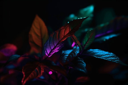 Light neon background with leaves. Colorful botanical backdrop with shiny gradients on plants. Exotic floral branch with pink and blue neon colors. Organic twigs with beautiful illumination