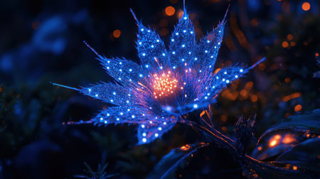 Leaves with luminescent patterns shine brightly against a dark background, creating a magical atmosphere.