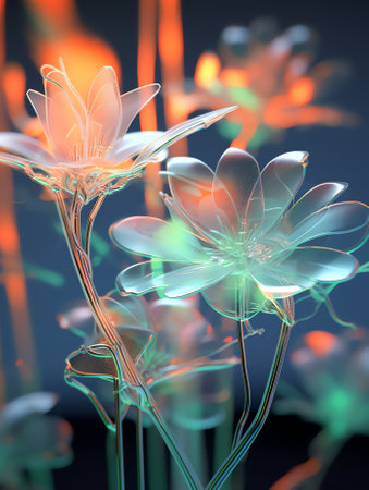A transparent glass flower with neon azure light outlining its petals. The cool, vibrant glow enhances the ethereal beauty of the flower, creating a captivating effect.