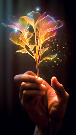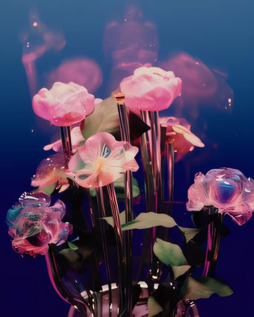 Experience a mesmerizing floral sculpture with holographic flowers that shift colors, accented by bioluminescent highlights, set against a dark, dreamy backdrop.
