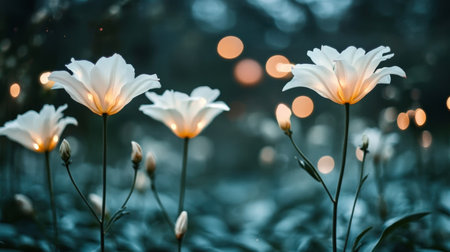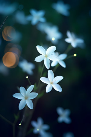 Delicate White Flowers Illuminating a Dark Garden at Night, Creating a Serene and Dreamy Atmosphere