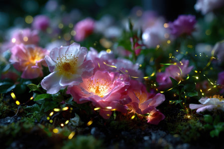 Glowing fireflies dance around blooming pink roses in a serene garden setting during early evening.
