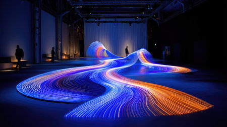 An abstract light sculpture dominates a darkened interior space. The artwork features flowing lines of orange and blue light, creating an impression of movement and energy. The composition uses dramatic lighting and is set against a simple backdrop, suitable for illustrating concepts of technology or design. Its visual impact lends itself to diverse commercial applications.