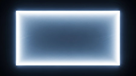 A dark, minimalist rectangular frame is dramatically illuminated by a bright white light emanating from its edges, creating a glowing effect.