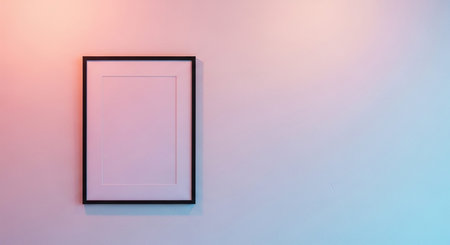 A black framed hangs on a wall bathed in a soft gradient of pink and blue light creating a minimalist and serene atmosphere.