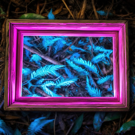 pink wooden frame with blue fern leaves in the forest. AI generative