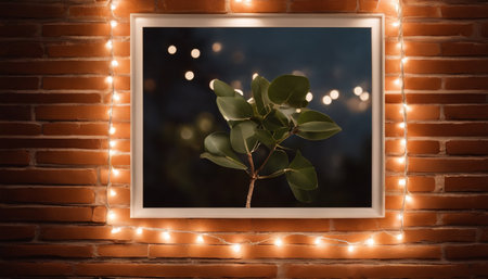 Photo frame with ficus tree on brick wall background with bokeh lights