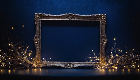 Old vintage photo frame on dark blue background with lights and bokeh