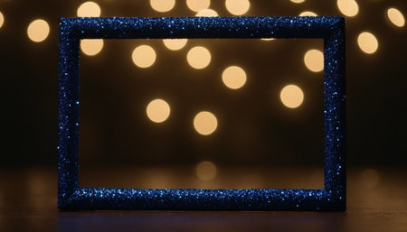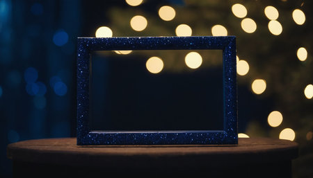 Blue photo frame on wooden table in front of blurred Christmas lights background