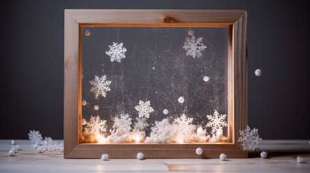 Christmas decoration with snowflakes in a wooden frame on a dark background. Generative AI.