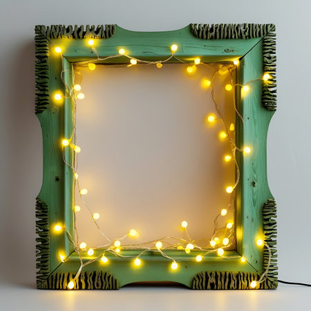 A rustic green wooden picture frame is adorned with a string of warm yellow fairy lights, creating a cozy and festive atmosphere.