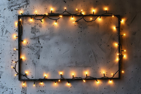 Blank photo frame with Christmas lights on dark background, copy space