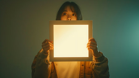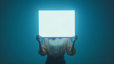 Young woman holding a blank white board in front of her face in the fog
