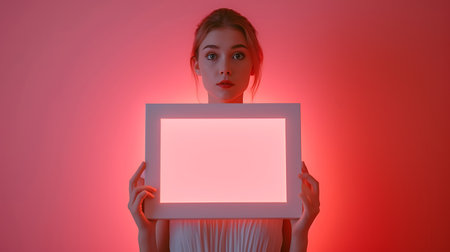 Young woman holding a white frame in front of her face on a pink background
