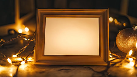 A photo frame mockup with an empty white canvas, placed on the floor beside Christmas decorations like lights and ornaments. The frame is made of light wood, adding warmth to its design. This scene creates a festive atmosphere for the New Year's celebration. --chaos 30 --ar 16:9 --v 6.1 Job ID: 9c8b223f-fc61-4810-9848-cd89ed9aa24b