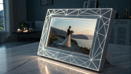 Illuminated frame displays serene coastal wedding photo