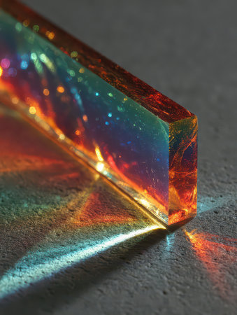 A stunning acrylic prism creates a dazzling array of colorful light reflections. Perfect for artistic and abstract photography, showcasing vibrant hues and shapes.