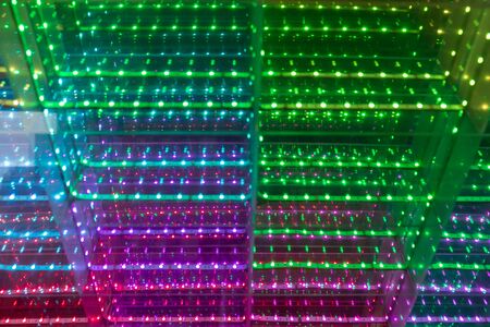 This top view showcases a vivid neon lighted disco floor featuring a dynamic pattern of colors, ideal for energetic dance events and festive gatherings theme. Isolated on white background.
