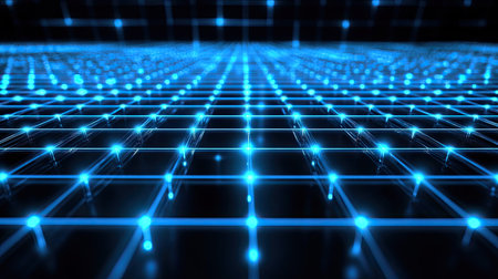 Digital showing infinite digital grid stretching into the distance with glowing blue lines and nodes against a dark background. resolution...