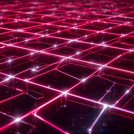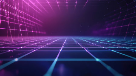 This image showcases a futuristic digital grid illuminated by neon lines against a dark background. It conveys a sense of advanced technology and infinite possibilities, ideal for creative projects.