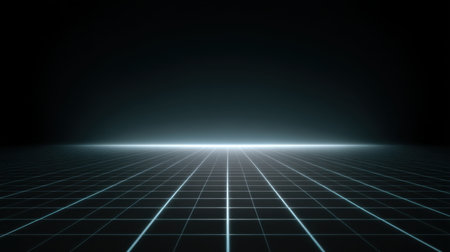 This image features a dark, futuristic digital background with a grid pattern and a soft glowing horizon, perfect for creative projects, presentations, and visual effects.