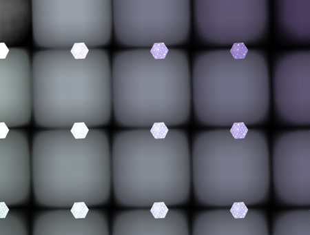 An overhead perspective reveals a geometric design featuring a grid of blue squares accented by yellow illuminated elements. The visual characteristics incorporate a pattern with depth of field and soft lighting. This composition could be suitable for various commercial uses, including website backgrounds or graphic design applications.