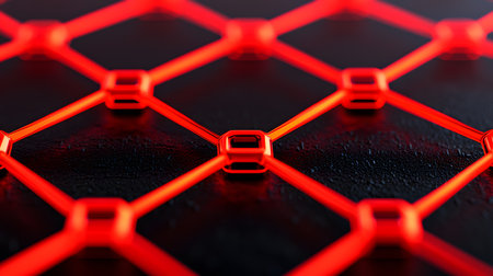An abstract image featuring a series of glowing red hexagonal nodes interconnected by lines against a dark, textured surface. The atmosphere feels high-tech and modern.