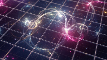An abstract grid in space with glowing nebulae and intertwined light trails in vibrant pink and blue colors.