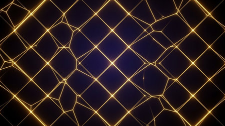 A geometric network of thin golden lines forms interconnected squares and irregular polygons against a deep blue background, creating a glowing, abstract structure.
