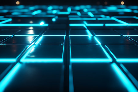 This vibrant abstract grid pattern features glossy tiles illuminated by neon lights, creating an eye-catching design ideal for modern projects.