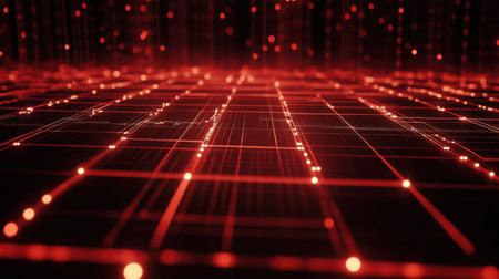 Explore a striking digital landscape featuring a red grid filled with luminous points, symbolizing data flow and technology in a captivating abstract scene.