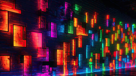 Colorful neon lights with vertical lines create a tech inspired abstract background in dark studio