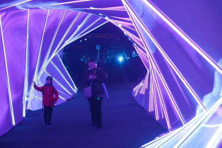 Zagreb, Croatia - 16 March, 2018 : Festival of lights. People walking through a lighted tunnel with colorful neon lights in the center of Zagreb.