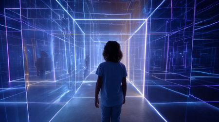 3d rendering of a man in a dark tunnel with neon lights