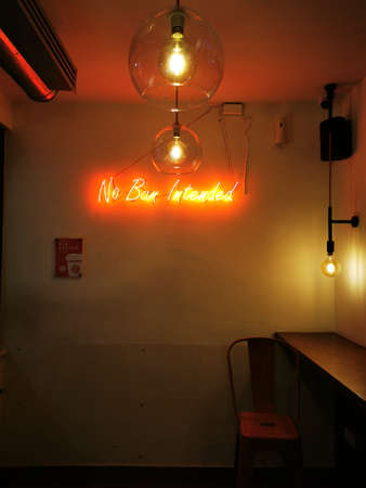 Lamp in a cafe. Neon sign on the wall. Night life.