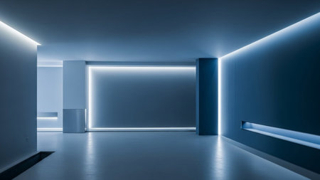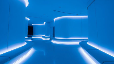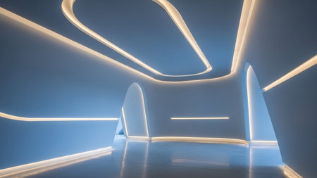 A minimalist interior featuring smooth, curved white walls illuminated by integrated warm and cool LED lighting,...
