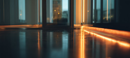 A quiet hallway glows with soft light trapped in the glass, reflecting off the door frame like a quiet ribbon of calm. The interior feels still and peaceful, bathed in gentle glass reflections.