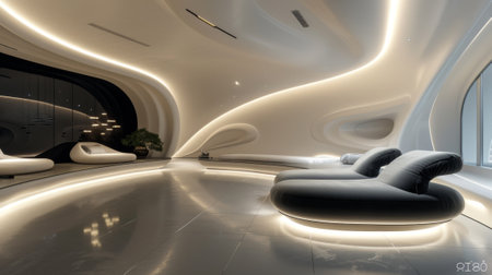 A sleek, futuristic lounge featuring curved architecture, modern furniture, and ambient lighting, creating a stylish and serene atmosphere.