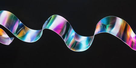 A horizontal, wavy ribbon of glass with iridescent colors on a black background. The ribbons form an elegant and flowing pattern that adds vibrancy to the minimalist setting. This is suitable for creative projects where vibrant coloration against solid backgrounds creates visual impact. --ar 2:1 --v 6.1 Job ID: f6bd6b29-3702-41c8-9ffb-36dfa4873960