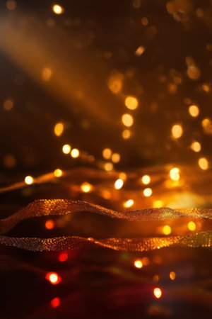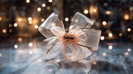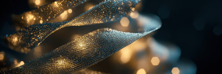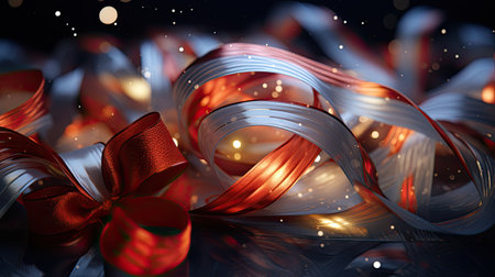Festive holographic ribbon decoration with warm brightness and sparkling reflections on a radiant ba