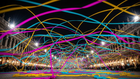 Colorful ribbons swirl in a dark space illuminated by bright lights during a vibrant event at night