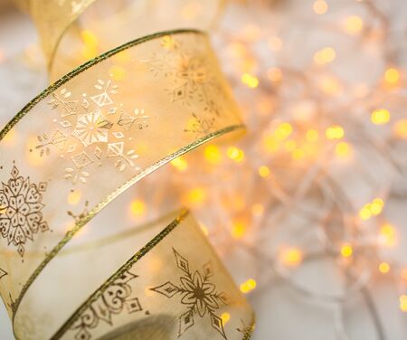 Decoration xmas gold color ribbon with garland lights on background
