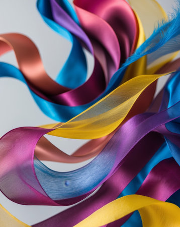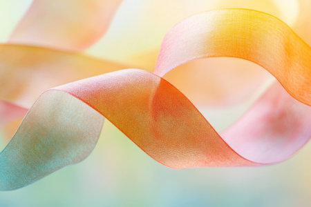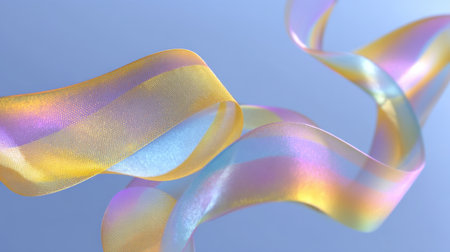 A beautiful translucent ribbon dances through the air, displaying vibrant pastel colors of blue, yellow, and pink. Ideal for creative projects.