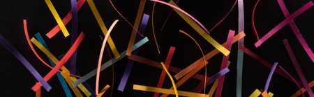 top view of multicolored abstract lines scattered isolated on black background, connection and communication concept
