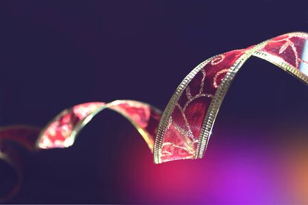 colorful ribbons on a red background, closeup of photo