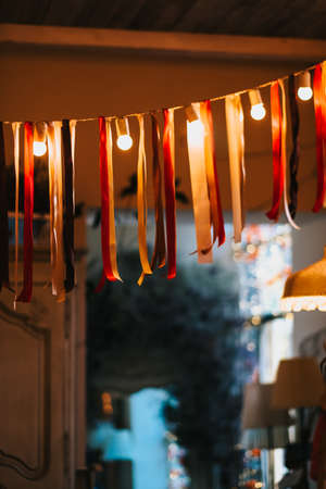 background with garland and multicolored ribbons in the house. High quality photo