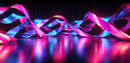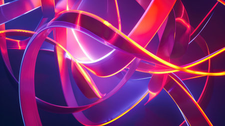 A bold and artistic 3D background composed of interwoven metallic ribbons reflecting vibrant neon colors. The abstract composition creates a sense of movement and energy, with complex light interactions and futuristic aesthetics.