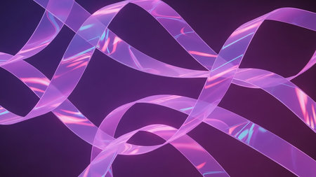 Translucent, swirling ribbons of light in vibrant purple and pink hues create an abstract, dynamic pattern against a dark background.